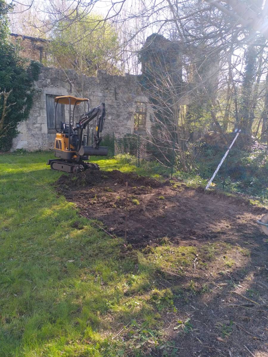 - Décaissement (facultatif mais recommandé) : Si le sol n'est pas stable ou si vous souhaitez une bonne base, vous pouvez décaissement la zone sur une profondeur de 10 à 20 cm. Cela permet d'installer différentes couches pour un meilleur drainage (si nécessaire) et une surface de jeu dur et stable.