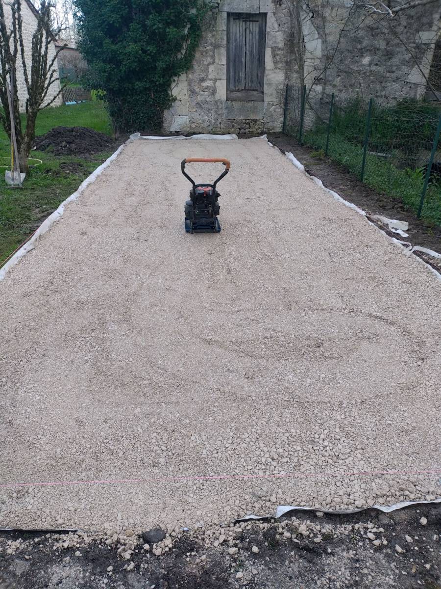 - Gravier fin : La couche de surface idéale est constituée de gravier fin (type 0/6) appelé "fines concassées" ou "sable stabilisé". Étalez cette couche sur une épaisseur de 3 à 5 cm.