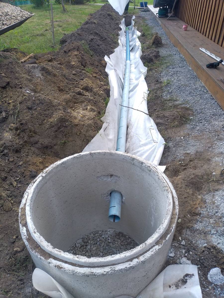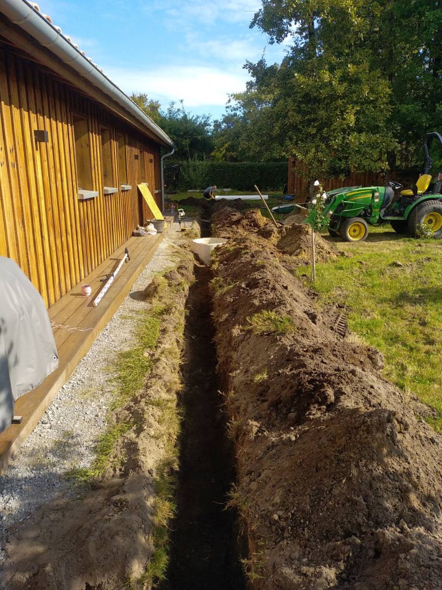 Paysagiste pour la réalisation d'un drainage d'une partie des eaux pluviales chez un client à Pontenx dans le Nord des Landes pour gérer l'eau de pluie qui ruisselle sur les toits et le sol afin d' éviter les inondations sur le terrain du client et de protéger de humidité les fondations de l'habitation