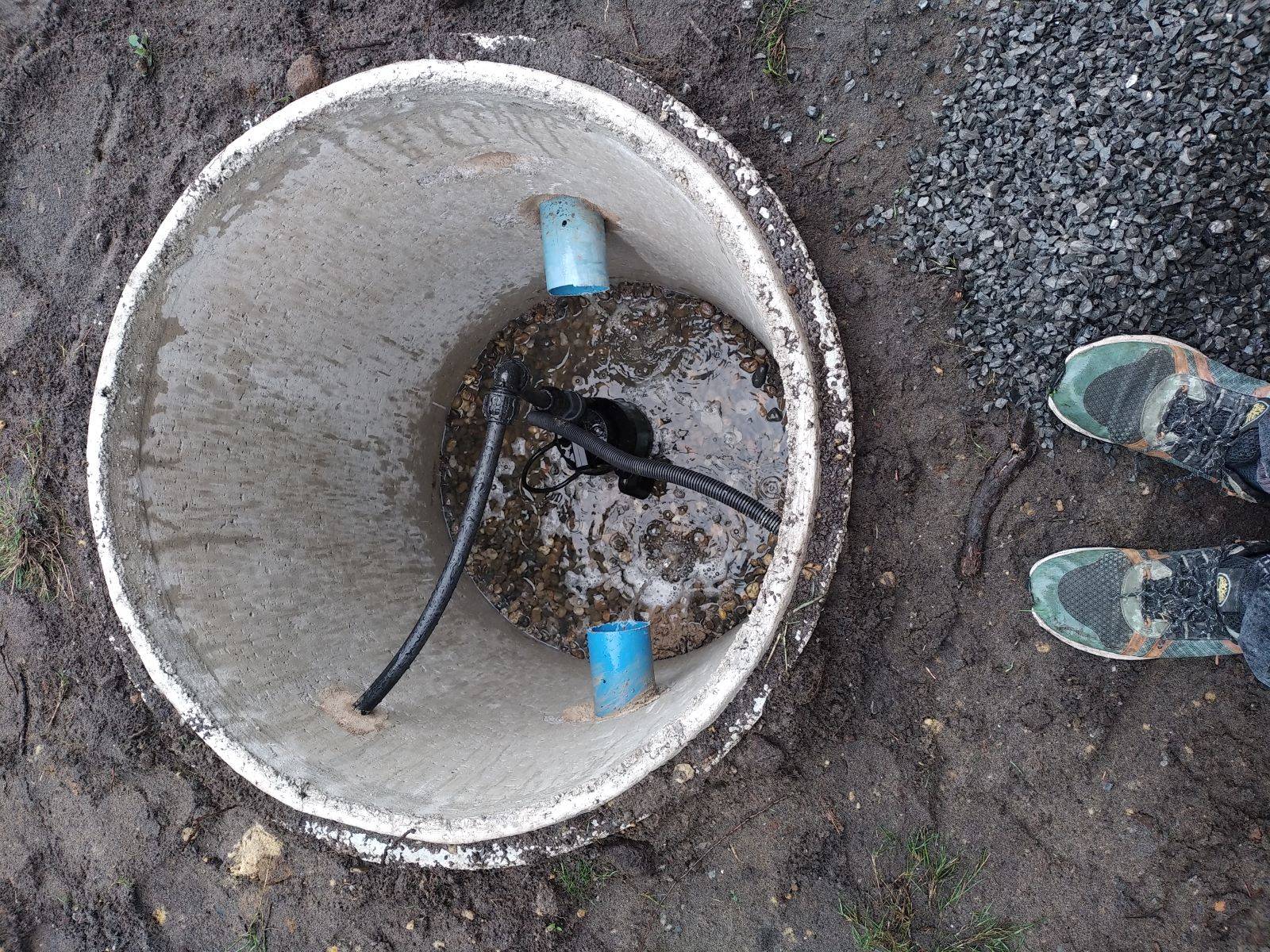 Un drain (tuyau perforé en PVC) entouré de gravier et de géotextile est enterré à proximité de l'habitation principal (à environ 50 cm de profondeur) avec une pente (1 à 2 %) pour capter l'eau des gouttières et l'eau de surface et la diriger vers un regard récepteur . Un dispositif de pompage permet l'évacuation rapide ce l'eau